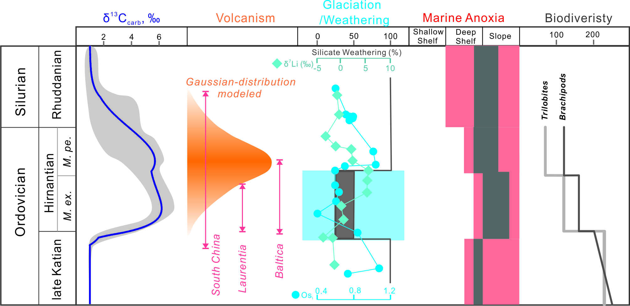 ↑ 奥陶纪末-志留纪初生物地质事件综合图
