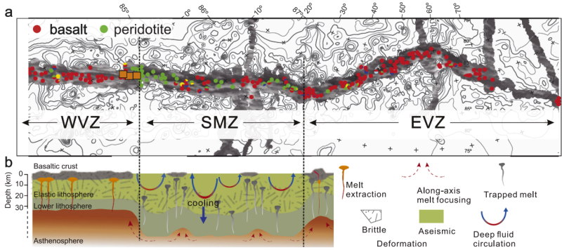 近日,中国科学院广州地球化学研究所杨阳特任研究员与美国哈佛大学及塔尔萨大学的科研人员合作,通过对北冰洋Gakkel洋脊西部火山区和中部弱岩浆活动区267件玄武岩样品(图1)的系统研究,发现Gakkel西部发育正常厚度洋壳的区域,主要产出亏损的N-MORB,且其岩浆组成从西到东显示出系统的地球化学变化,揭示了地幔逐渐亏损,部分熔融程度逐渐降低的过程。而Gakkel中部洋壳极度不发育出现大部分橄榄岩出露的地区,却产出富集的E-MORB,但主量元素却亏损CaO,具有极低的CaO/Al2O3比值。提出Gakkel西段地幔是“饱满”但“亏损”的,而中段地幔是“贫瘠”但“富集”的。饱满和贫瘠代表了它们熔融产生岩浆的能力,而亏损和富集则指它们在微量元素上的富集程度。且中部地幔的潜在温度极低,以此提出,极度贫瘠的地幔源区再加上异常低的地幔潜在温度的综合作用下,形成了极少岩浆的Gakkel中段少岩浆作用区。