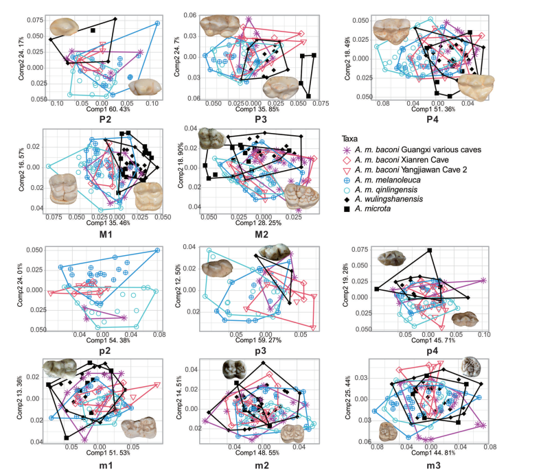 近日,中国科学院古脊椎所的副研究员江左其杲和国家自然博物馆,南京师范大学,贵州山地所等科研院所的同行合作,共同完成了第四纪大熊猫牙齿轮廓演化的工作。研究团队关注更新世的几种不同的熊猫,以及现生2个大熊猫的亚种,运用几何形态学的方法,探讨了第四纪大熊猫牙齿轮廓的演化。相关论文发表在《历史生物学》(Historical Biology)。