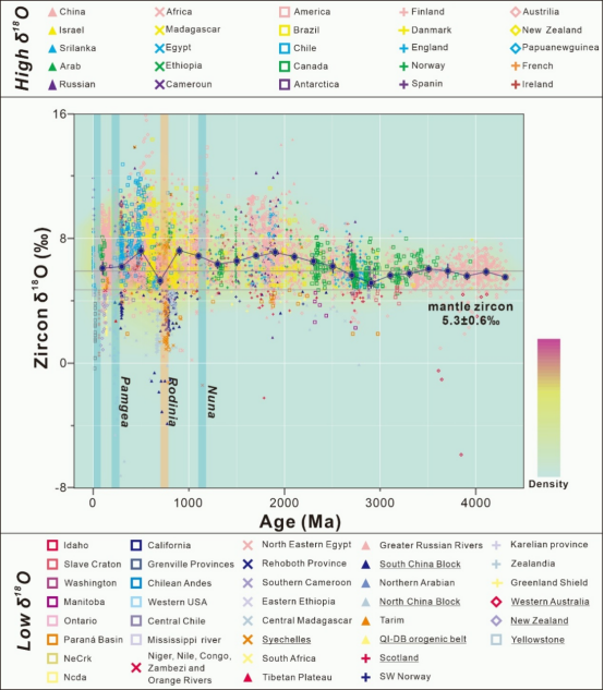 本文收集了全球已发表的13,500个锆石的氧同位素数据(图1),为探讨Rodinia超大陆的重建模型和裂解动力学机制提供锆石氧同位素证据。在对比了以华南为主的新元古代中期低δ18O岩浆的主微量元素组成以及锆石Hf、O同位素后,取得了以下创新性认识: