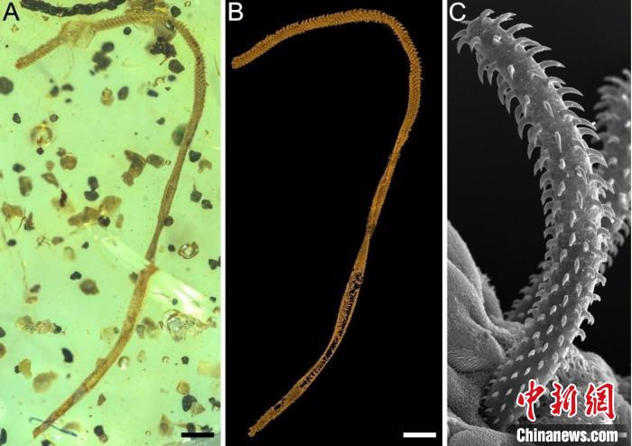 ↑ 缅甸克钦琥珀中的绦虫化石(A、B)与现生锥吻目(C)的比较。 (中国科学院南京地质古生物研究所供图)
