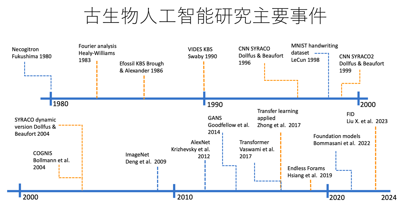 ↑ 图1. 古生物人工智能研究主要事件(橙色)与部分人工智能重要算法与数据集(蓝色)时间线