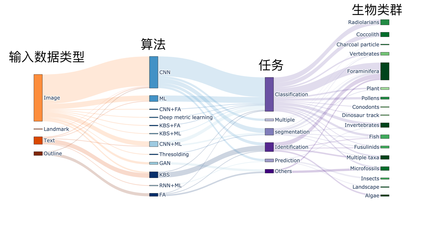 ↑ 图2. 人工智能古生物学研究使用的输入数据类型、算法、任务、生物类群