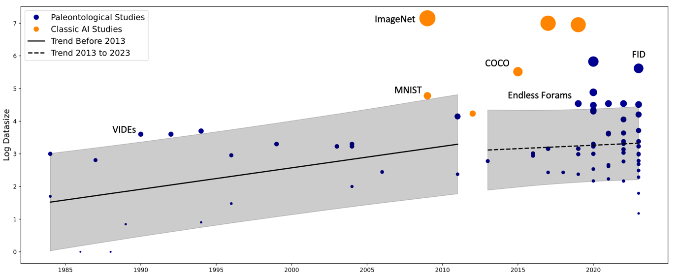 ↑ 图3. 人工智能古生物学数据集(蓝色)与主流人工智能数据集(橙色)大小对比