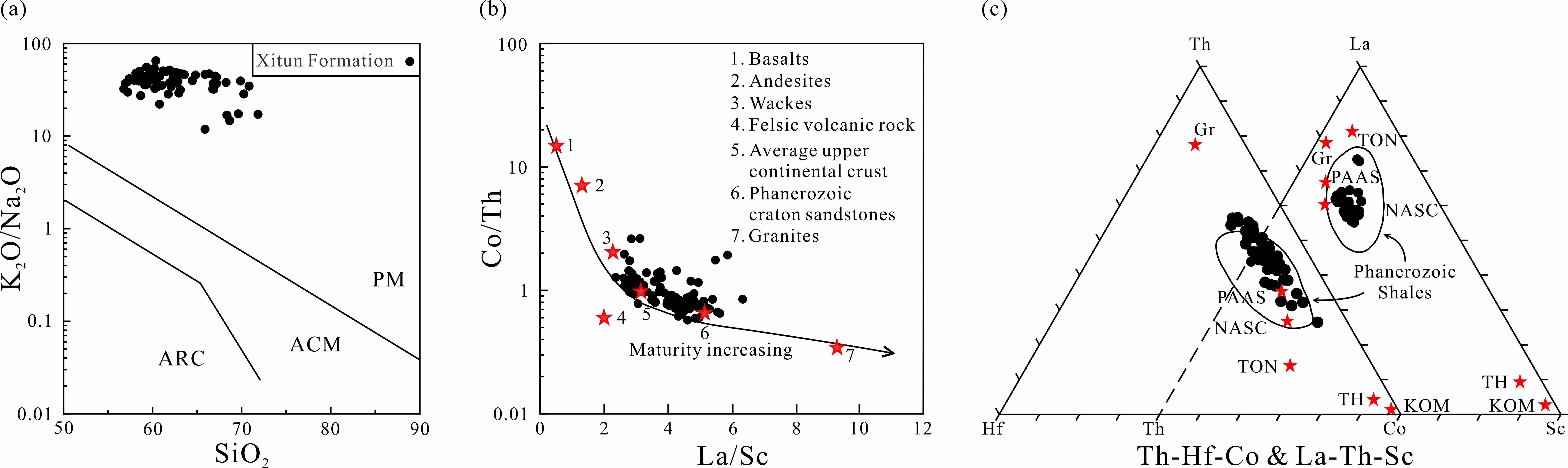 西屯组沉积期的沉积构造背景、物源、古气候、古氧相等也是恢复西屯脊椎动物群生境的重要方面。研究团队对滇东曲靖地区西屯组复合剖面上93个地化样品中主量、微量和稀土元素进行了全面的分析,得出如下新认识:西屯组样品的主量元素测试数据在K2O/Na2O–SiO2判别图解上的投点分布特征,指示地处华南板块西南边缘的滇东曲靖地区在早泥盆世期间位于被动大陆边缘上;微量及稀土元素的测试数据在Co/Th–La/Sc及Th–Hf–Co与La–Th–Sc判别图解上的投点特征则指明,西屯组样品的化学成分更接近于平均上陆壳和显生宙克拉通砂岩的化学成分,其物源以稳定型的沉积岩为主;西屯组样品中的Zr值以及Rb/Sr、Th/Sc与Cr/Th比值的变化曲线及稀土元素特征(轻稀土富集、明显的Eu负异常)等均表明,西屯组的主要沉积物有长英质和镁铁质碎屑两种,镁铁质碎屑的增加与三次海水淡化事件密切相关,位于东侧的会泽-牛头山古岛是西屯组最有可能的的沉积物源区;CIA*与ICV值及Ti/Na、Al/Na和Rb/K比值等是对风化强弱和古气候变化非常敏感的地球化学指标,西屯组地化样品中的相关曲线变化特征表明其沉积时期以温暖湿润的热带气候为主,风化作用不强;V/ Cr、Ni/Co、V/(V + Ni)、U/Th和Ce/Ce*比值常被用来分析古氧化还原条件,西屯组地化样品中的相关曲线变化特征明确指明其沉积期为氧化环境。