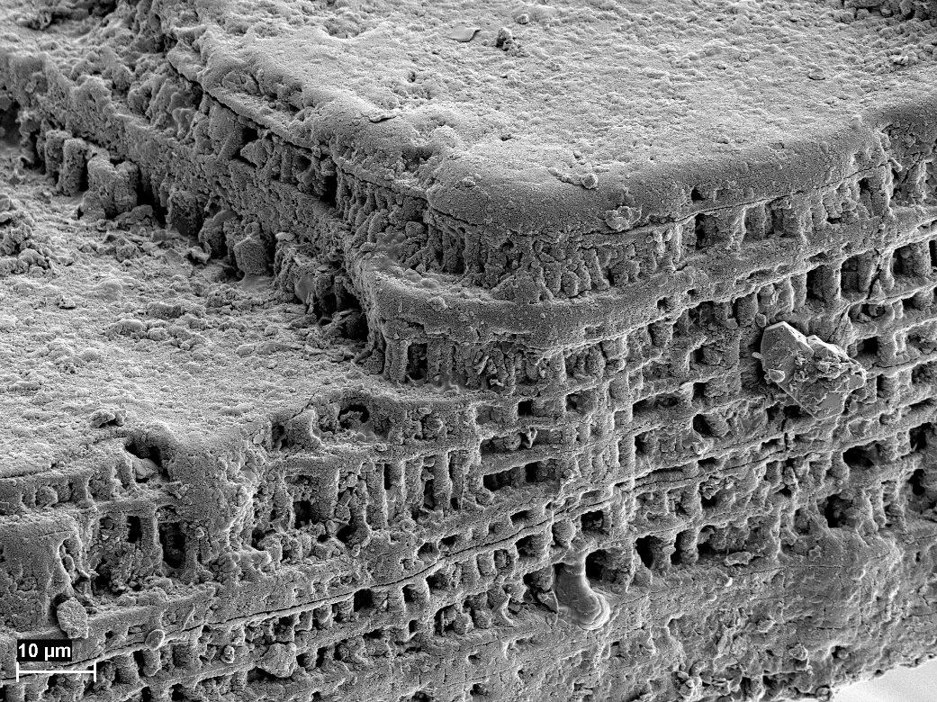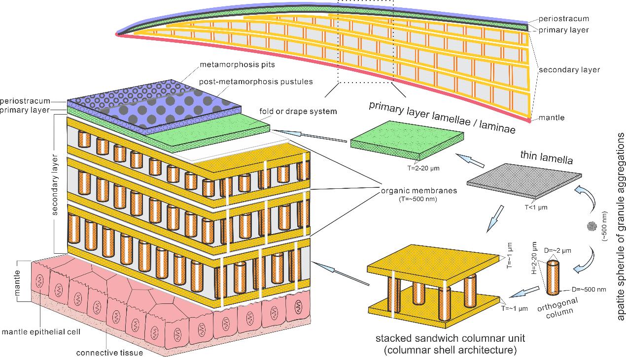 研究表明,这类腕足动物的磷酸钙质壳体具分层级的构造特征,包括外角质层、初级板层和次级柱状层。壳层间有机质膜层和表皮细胞印模的发现,揭示了它们是具有高度生物控制和有机基质调节的。矿化壳体以纳米磷灰石球粒凝聚而成的微型圆柱体为主要夹层单元,在外表皮细胞分泌的有机质膜调控下,通过“三明治堆叠模式”构建而成。