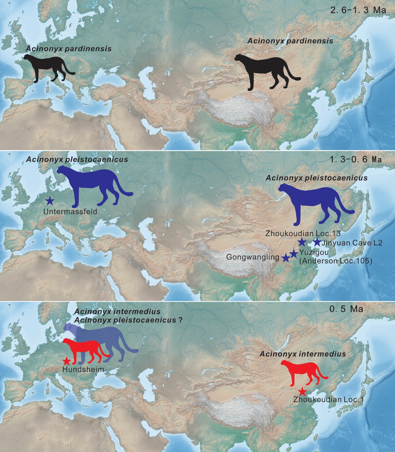 ↑ 图1. 欧亚大陆猎豹地史分布图