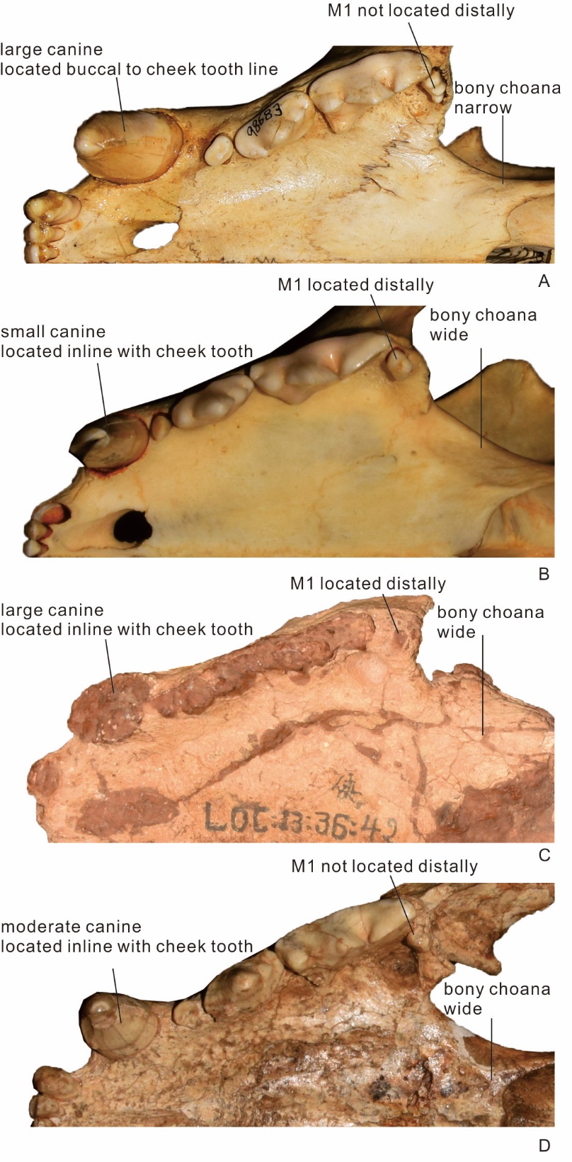 ↑ 图3. 更新猎豹与相关属种牙齿和上颌结构对比图。A.美洲豹,B.现生猎豹,C.更新猎豹,D.巨猎豹