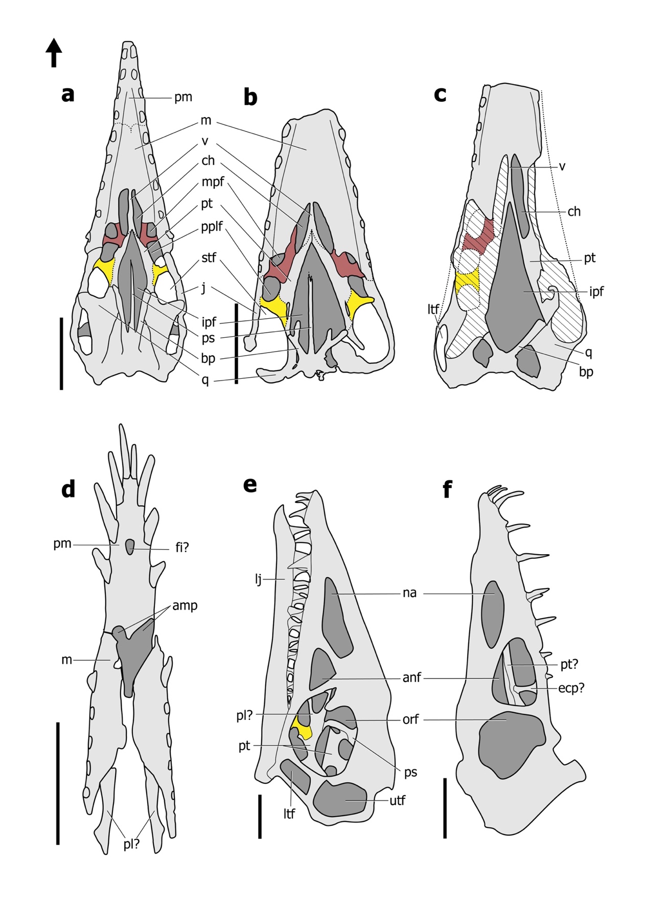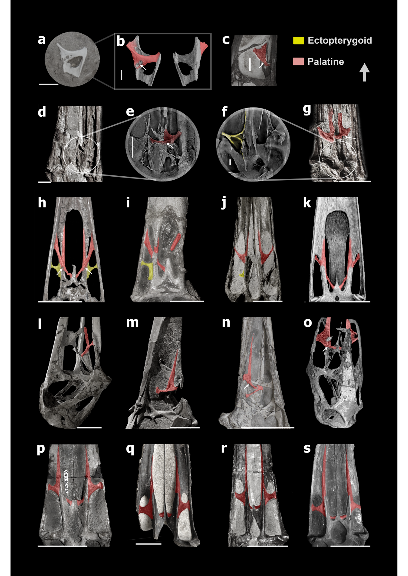 ↑ 图3 非翼手龙类腭区结构图(黄色:外翼骨;粉色:腭骨)