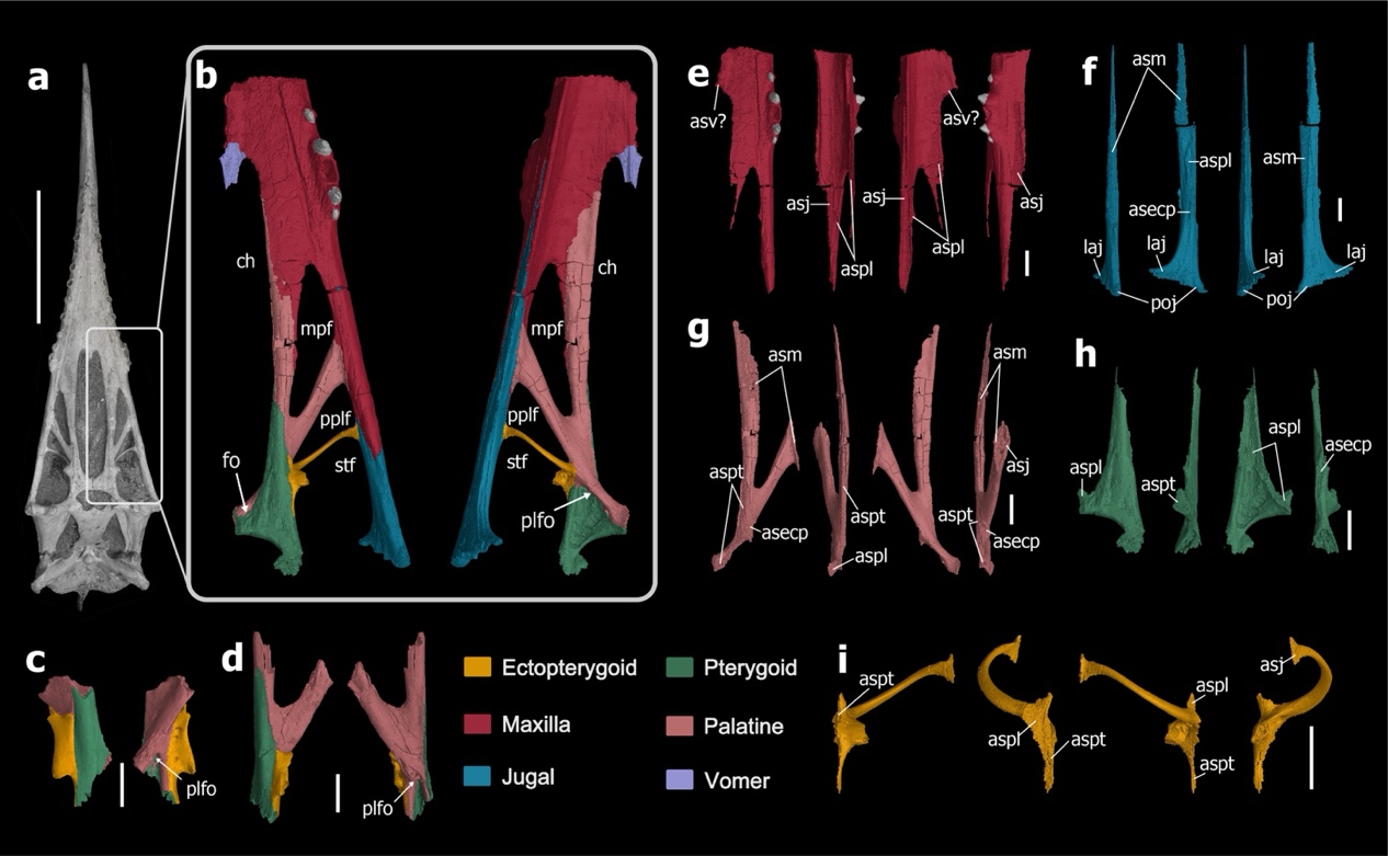 新模式明确了内鼻孔外侧向后第一个窗为上颌骨腭骨窗,而不是前人所认识的腭后窗,而与其它主龙类同源的腭后窗则在上颌骨腭骨窗之后。在一些翼手龙类群中,由于前后分隔腭后窗和颞下窗的外翼骨并未与腭区边缘相接,腭后窗则与颞下窗合二为一。关于这些骨骼结构的厘定,得益于本次研究利用高精度CT扫描和三维重建骨骼结构关系。之前关于上颌骨的腭区,包括腭骨、翼骨、外翼骨形态结构和延展位置均有不同的推测,如将腭骨外支的部分推测成外翼骨,将外翼骨推测成翼骨外突等等。本次研究则明确了这些骨骼的形态和接触关系,如翼手龙类中呈现出Y型的腭骨,翼骨前突腹侧叠覆腭骨的结构关系等。