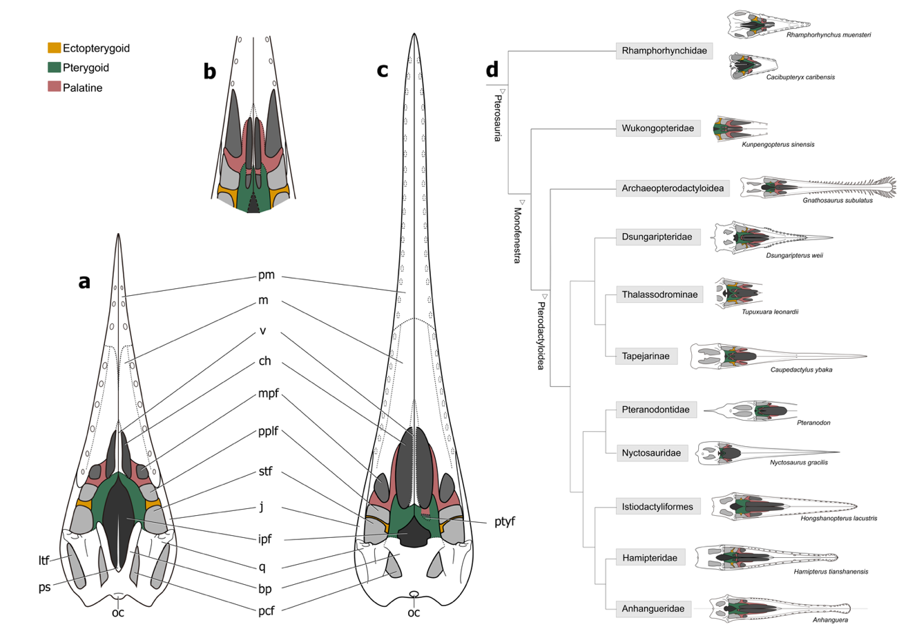 c,翼手龙类的腭区结构模型;d,翼龙内部各类群腭区重建图(古脊椎所供图)