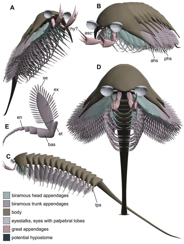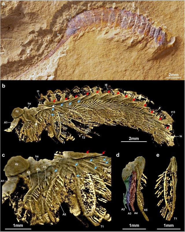 科研人员介绍,距今约5.2亿年前的早寒武纪节肢动物中有一个特殊分支,它们的第一对附肢不是当今的蜈蚣等节肢动物头部常见的触角,而是一对用于捕食的、强壮的大附肢。它们也因此被称为“大附肢节肢动物”。长尾螳螂虫正是大附肢节肢动物的一种。