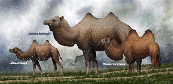 ↑ 图1 灭绝种诺氏驼复原图(中复原图)与2种现生种野双峰骆驼(左)和家双峰驼(右)(陈瑜(菊石君)绘)