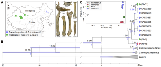 曾有学者认为已灭绝的诺氏驼是现生双峰驼的祖先。对此,本该项研究获取了我国东北地区7个晚更新世诺氏驼化石材料的完整线粒体基因组及部分核基因组,利用诺氏驼的古基因组与欧亚及非洲大陆现生真驼骆驼的同源分子数据进行对比分析,研究发现灭绝种诺氏驼在线粒体基因组系统树上未形成单系,而是落在野双峰驼分支内,该混杂分支与家双峰驼互为姊妹群(图2B);但在核DNA主成分分析中,诺氏驼与野双峰驼可明显区分(图2C)。相对于家双峰驼,该本研究在分子水平上证实得到令人意外的发现,即:相对于家双峰驼,诺氏驼与野双峰驼的亲缘关系更近。