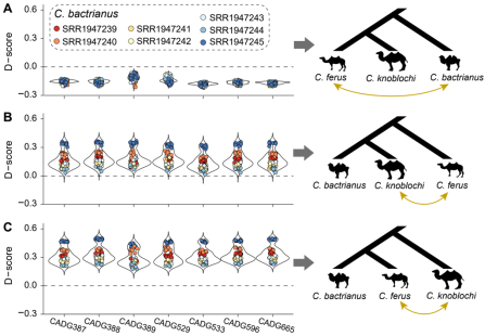 研究采用D-统计对诺氏驼与现生双峰骆驼的祖先种群可能存在的基因流动进行分析,研究结果不仅揭示了野双峰驼和家双峰驼之间存在有广泛的基因流动,还表明显示诺氏驼与野双峰驼之间的基因流动显著多于其与所研究的家双峰驼祖先种群的杂交(图3)。综上,该本研究揭示证实:在骆驼真驼属动物的进化史上,3种双峰骆驼不同种之间存在广泛杂交,种间杂交并非现代种群所独有。