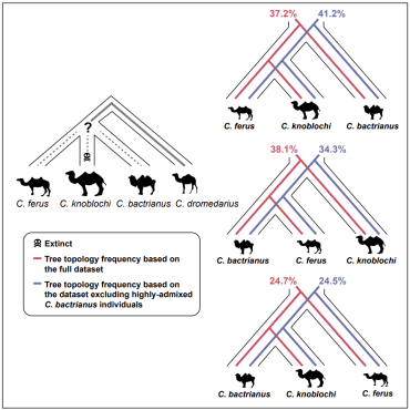 为深入理解认识前述诺氏驼与野双峰驼线粒体-核DNA聚类结果的不一致性,并厘清已灭绝诺氏驼与2三种现生双峰骆驼的谱系演化关系,该本研究还进行了滑窗系统发育分析。结果显示,不同拓扑结构的支持频率较为相近 (图4),这可能是由于3三种双峰骆驼共存时广泛存在的基因流动模糊了不同其谱系间演化关系信号。由此,该研究认为,诺氏驼与家双峰驼、野双峰驼之间的演化关系不能模式化为简单的分叉树,研究推测其应为网状结构。同时,该研究还表明可见,若仅利用限于对现生双峰骆驼的基因组数据的研究,会低估欧亚大陆骆驼演化历史的复杂性,灭绝种诺氏驼的古DNA对准确揭示该种群自身演化以及系统认识其现生近缘物种真驼属动物的分子演化历史均具有非常重要的意义。