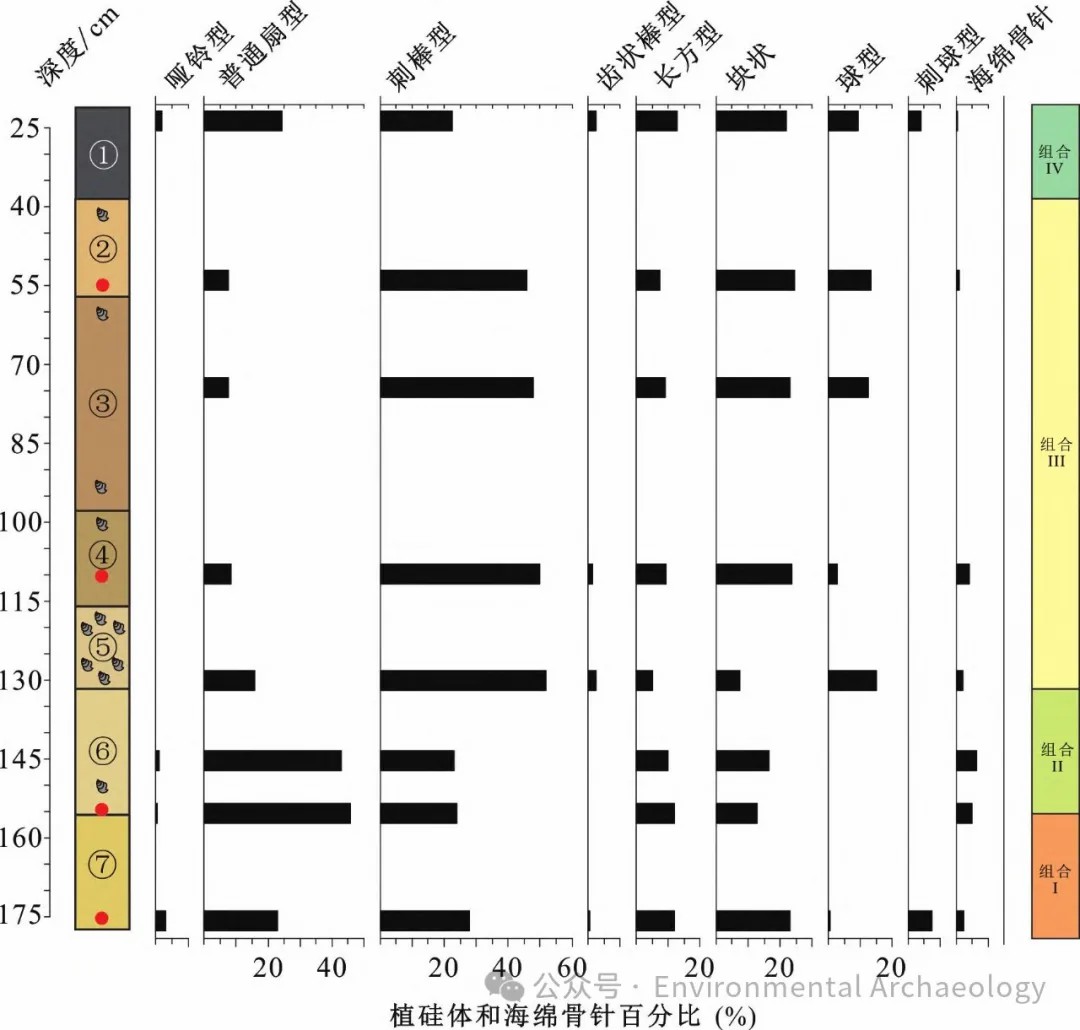 ↑ 图 4 江西岸遗址的主要植硅体与海绵骨针类型百分比