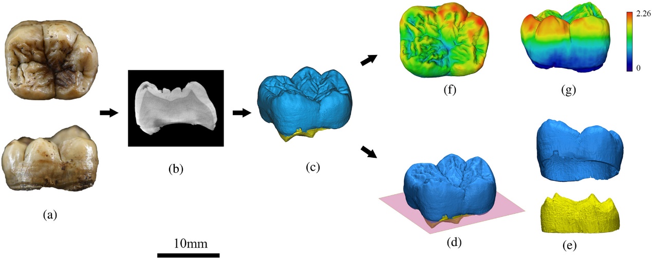 ↑ 图1 禄丰古猿臼齿三维釉质厚度测量及釉质厚度分布形态研究流程(张立召供图)