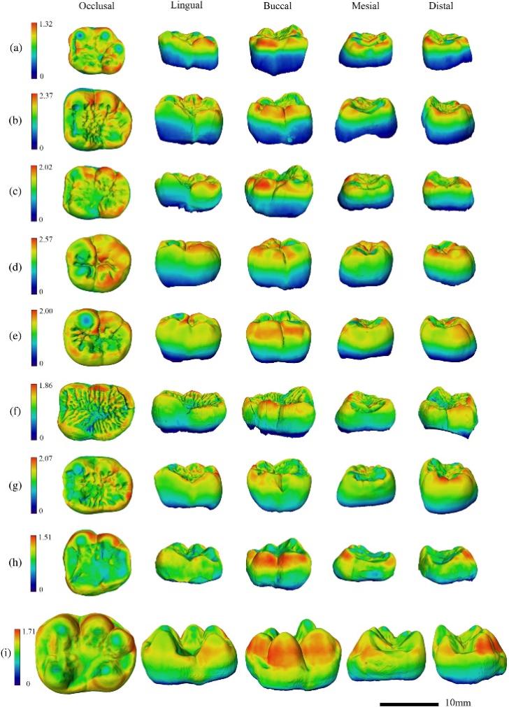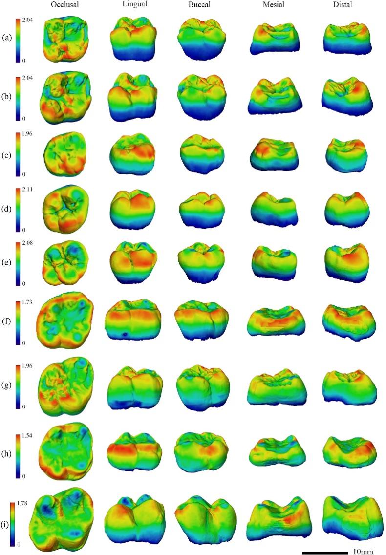 论文以“Three-dimensional molar enamel thickness and distribution patterns in Late Miocene Lufengpithecus lufengensis from Shihuiba,Southwest China”为题,古脊椎所张立召高级工程师为论文第一作者,赵凌霞研究员和胡荣博士(厦门大学副教授)为论文通讯作者,杜抱朴博士(首都医科大学讲师)为共同作者。在不损坏化石标本的前提下,对禄丰古猿臼齿三维釉质厚度及分布特征开展测量分析。利用显微CT技术,对68颗禄丰古猿臼齿进行三维虚拟重建,并将现代人、直立人、猩猩、化石猩猩、黑猩猩、大猩猩的臼齿作为比较数据,获取三维釉质厚度数据及釉质厚度分布形态,从定性及定量两方面分析禄丰古猿臼齿厚度的综合特征,为古猿釉质厚度研究提供了重要信息,并进一步探讨了禄丰古猿的食性范围及环境适应,为亚洲地区古猿及古人类演化提供新视角。