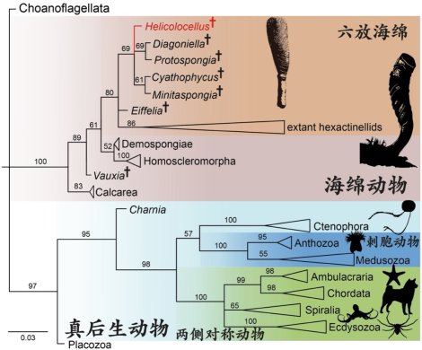 图3,螺旋网格海绵和其他动物之间的演化关系。螺旋网格海绵显示出与六放海绵相近的亲缘关系,属于冠群海绵动物。