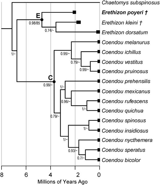 ▲图2 基于贝叶斯支端定年分析方法的美洲豪猪类系统演化树. 节点E:美洲豪猪属(Erethizon);节点C:卷尾豪猪属(Coendou)。