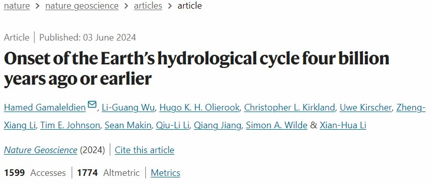 论文信息:Gamaleldien, H., Wu, LG., Olierook, H.K.H. et al. Onset of the Earth’s hydrological cycle four billion years ago or earlier. Nat. Geosci. 17, 560–565 (2024). https://doi.org/10.1038/s41561-024-01450-0