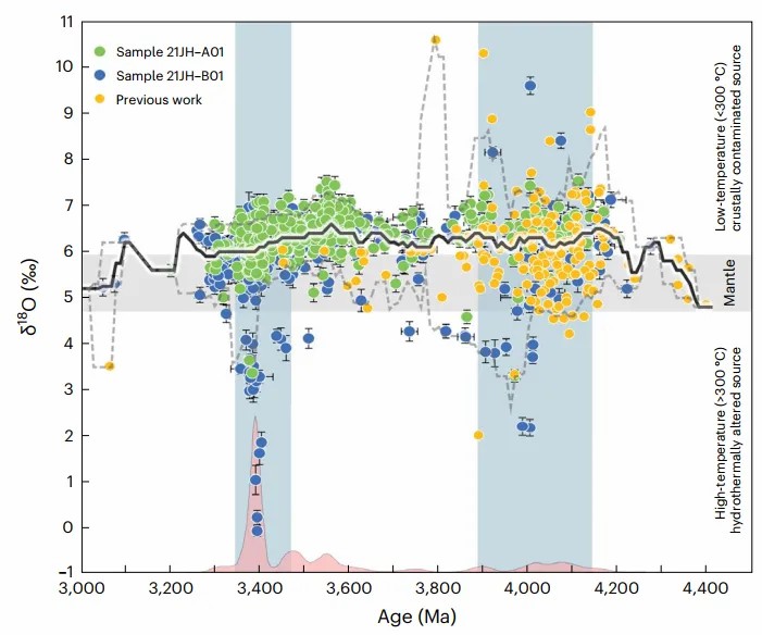 地球上最古老的岩石非常稀少,而且保存不完整,这给研究地球早期环境带来了巨大挑战。传统的地球化学方法,如分析岩石中的矿物成分和同位素组成,往往受限于岩石的保存状态。而锆石作为一种极耐腐蚀的矿物,能够在岩浆活动中形成,并且能够保存其形成时的氧同位素信息,成为研究地球早期水循环的重要突破点。