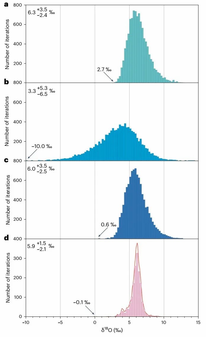 近日《自然·地球科学》杂志上发表最新文章,利用来自澳大利亚杰克希尔(Jack Hills)的锆石晶体的氧同位素组成来确定地球水循环的起源时间。所分析的锆石颗粒揭示了两次岩浆活动期,分别发生在 40 亿至 39 亿年前和 35 亿至 34 亿年前,其氧同位素组成低于地幔值(即18O/16O <5.3±0.6‰),大约在 40 亿年和34亿年前,最负的18O/16O值分别低至 2.0‰ 和-0.1‰。这意味着它们与大气降水(淡水)发生了相互作用。研究人员使用蒙特卡罗模拟来验证这一结论,结果表明只有大气降水才能导致锆石晶体出现如此低的氧同位素组成。