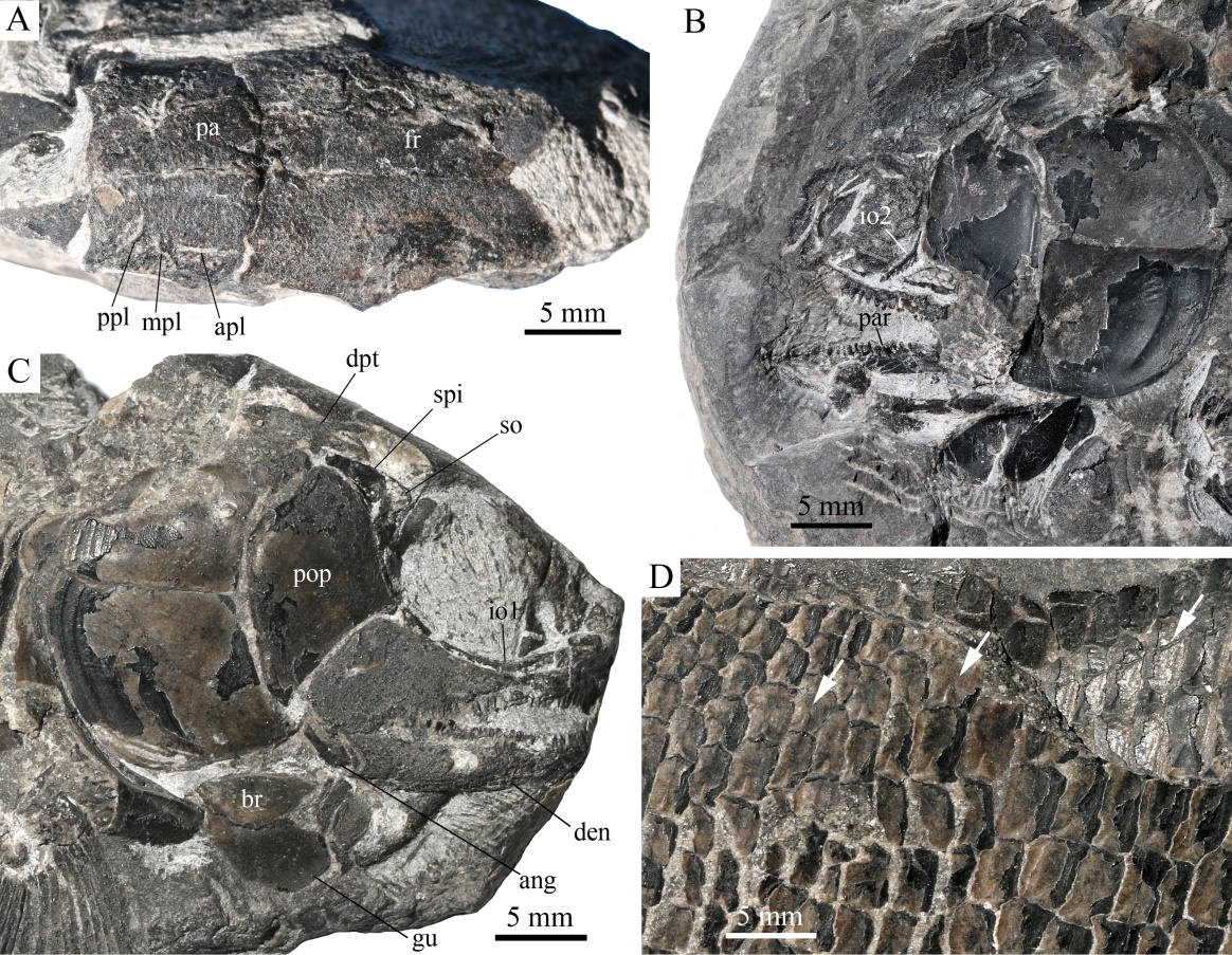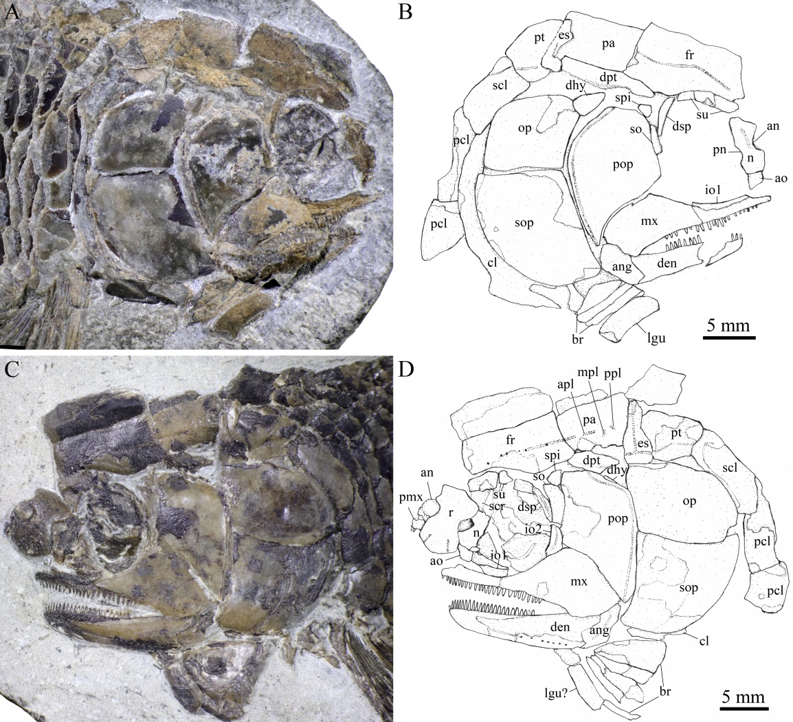 ↑ 吴氏三叠鱼头骨和肩带复原图