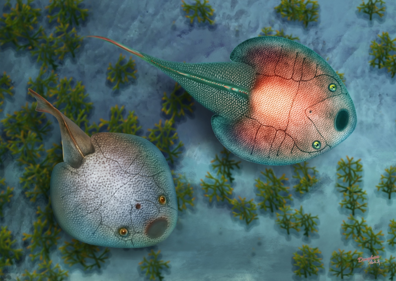 ↑ 图1. 曲靖坝鱼(右)与变异坝鱼(左)生态复原图(杨定华绘)