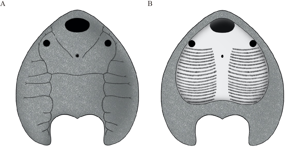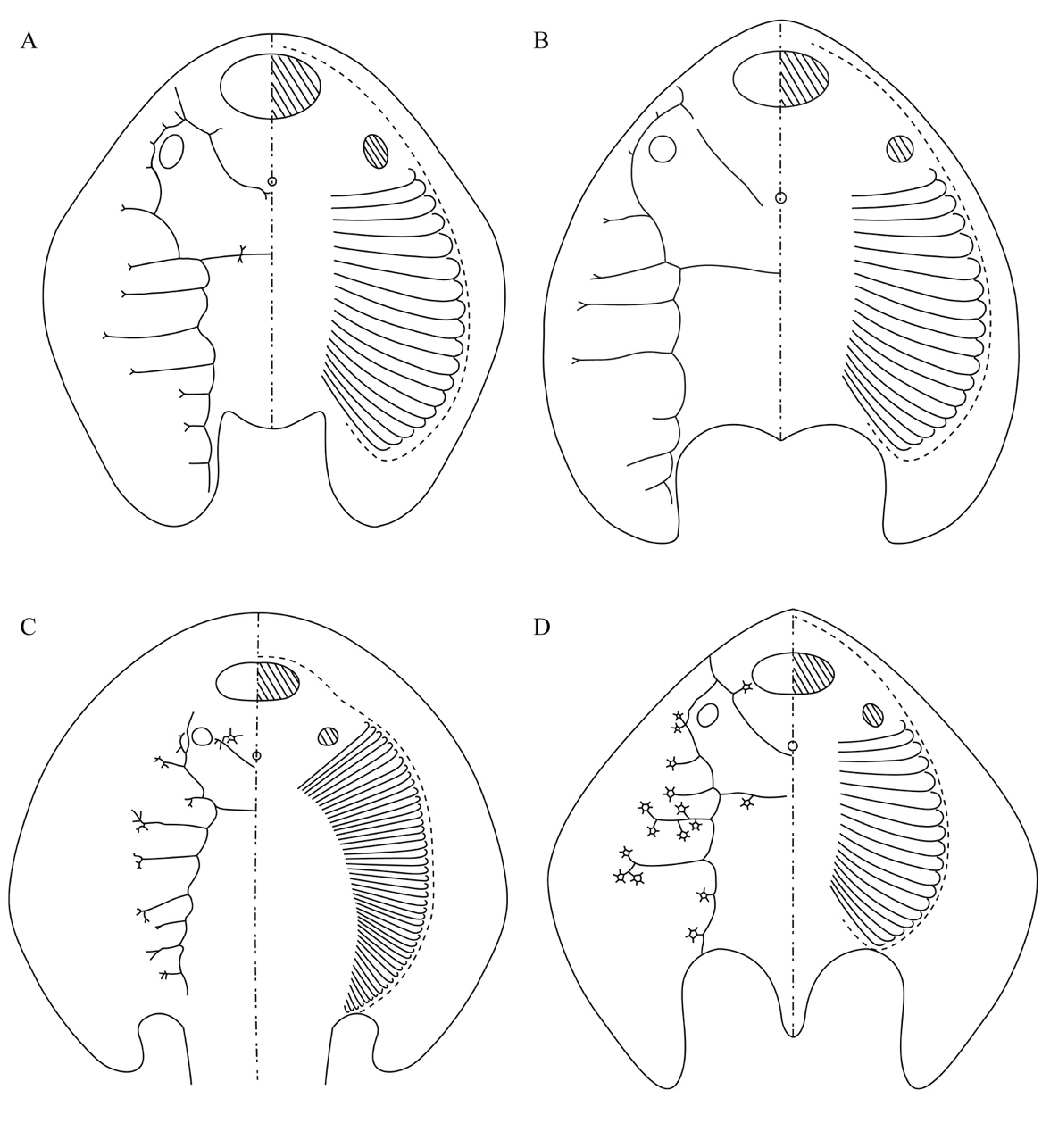 ↑ 图6. 坝鱼属、东方鱼属和宽甲鱼属之间的头甲形态和鳃囊特征对比。A.变异坝鱼;B.曲靖坝鱼;C.硕大东方鱼;D.曲靖宽甲鱼