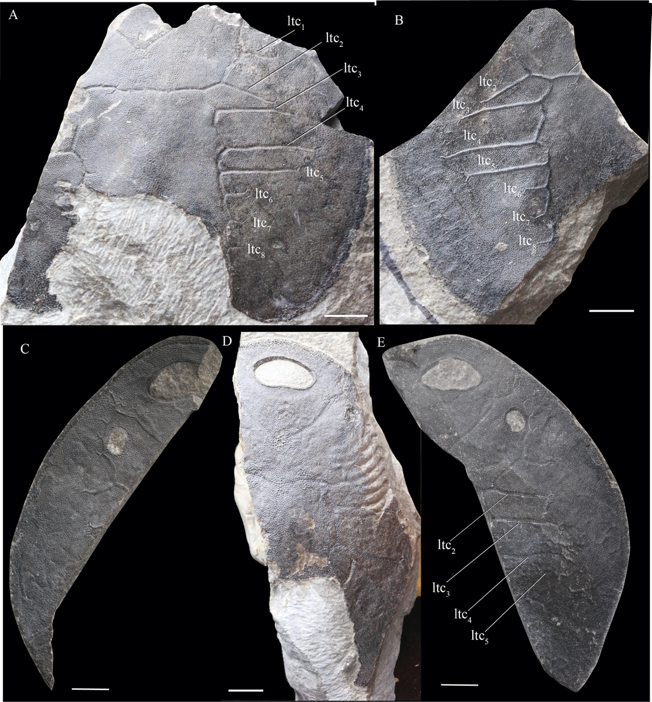 坝鱼属(Damaspis)在系统分类上属于盔甲鱼亚纲多鳃鱼目多鳃鱼科,是著名古鱼类学家王念忠、王俊卿先生于1982 年依据属型种变异坝鱼(Damaspis vartus)所建立。变异坝鱼的化石标本由中国科学院古脊椎动物与古人类研究所云南野外队于1979年底采集。因化石发现地位于云南曲靖西山水库大坝附近,故其属名被命名为坝鱼(Damaspis),种名变异(vartus)则表示该鱼头甲背部感觉管系统存在变异现象。本研究对发现于云南曲靖面店水库变异坝鱼的新材料进行了描述,进一步揭示了其感觉管系统的分布模式,证实了模式标本不对称的感觉管系统可能是保存上的假象,或是种内变异造成。多鳃鱼目头甲背面感觉管系统以廖角山多鳃鱼为代表,存在一个共同的模式,被称为“多鳃鱼型”感觉管系统。在这个基本模式的基础上,不同多鳃鱼类属种之间,感觉管系统会有不同程度的多样性演化。例如,宽甲鱼属的感觉管末端呈星状,而坝鱼属的感觉管末端具二分叉等,这些形态上的变化在分类上具有重要意义。在通常情况下,所有盔甲鱼类的感觉管系统都是左右对称的。然而,变异坝鱼的感觉系统却呈现出一定的不对称性,其模式标本头甲左侧具有5条较长的侧横管,而右侧却只有4条。因正常的“多鳃鱼型”感觉管系统,头甲每侧只有4条侧横管,因此王念忠、王俊卿先生将模式标本左侧多出的第5条长的侧横管解释为种内变异现象。本次研究显示,曲靖坝鱼新材料头甲右侧侧背管实际上发出8条侧横管,其中前5条侧横管较长,正好与模式标本左侧的5条侧横管一一对应,而其后多出的3条侧横管则很短小。因此,新化石证据表明头甲背面具有5对对称的较长侧横管是变异坝鱼的一个稳定特征,而模式标本头甲右侧缺少第5条长侧横管可能是保存上的假象,也可能是种内变异造成的。