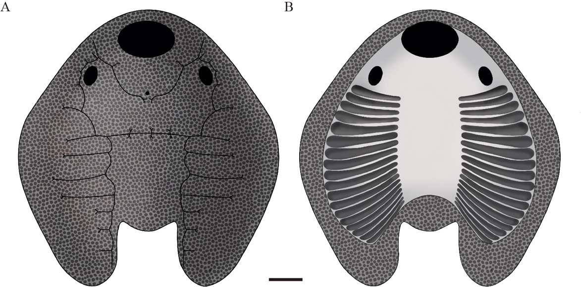 2018年以来,早期脊椎动物团队在云南曲靖的早泥盆世地层开展了大量的野外挖掘工作,在西山村库、面店水库等化石点相继采集到了大量多鳃鱼类的新材料,包括宽甲鱼、多鳃鱼、“曲靖东方鱼”和变异坝鱼等。本研究详细描述了来自云南曲靖早泥盆世洛赫考夫期西山村组“曲靖东方鱼”的新材料。新的研究结果表明,相比于宽甲鱼属,“曲靖东方鱼”与坝鱼属具有更多的共同特征,如头甲长略大于宽,侧横管末端呈二分叉,V字型后眶上管不汇合,以及至少7条侧横管从侧背管发出等。尽管“曲靖东方鱼”在鳃囊数目方面与宽甲鱼属相似,但坝鱼属同样具有18对鳃囊。宽甲鱼属最重要的一个鉴定特征是感觉管末端呈星状,而“曲靖东方鱼”感觉管末端呈二分叉状态,与宽甲鱼属明显不同,而与变异坝鱼(Damaspis vartus)特征一致。根据详细的形态学对比,本研究提出将“曲靖东方鱼”归入坝鱼属,而非原来的东方鱼属或宽甲鱼属,其真实身份应为曲靖坝鱼(Damaspis qujingensis)。