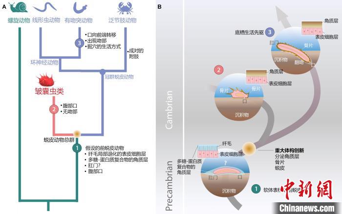 记者9日从西北大学获悉,中法团队联合研究揭示了中国寒武纪早期皱囊虫和贝雷虫共同构成蜕皮动物一个新的高级分类单元——皱囊动物门,并且否定了皱囊动物是由具有终端口的蠕虫状环神经动物简化而来的观点。