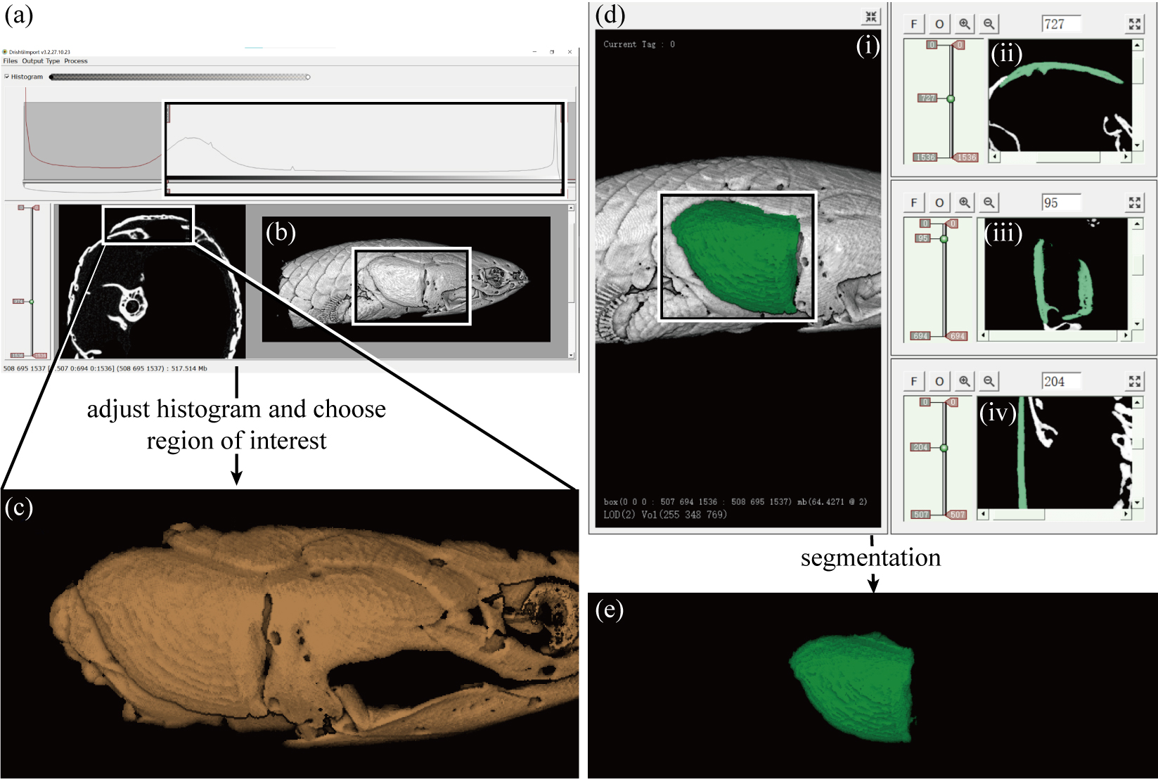 ↑ 使用Drishti Paint 3.2对多鳍鱼CT扫描数据右侧鳃盖骨进行分割