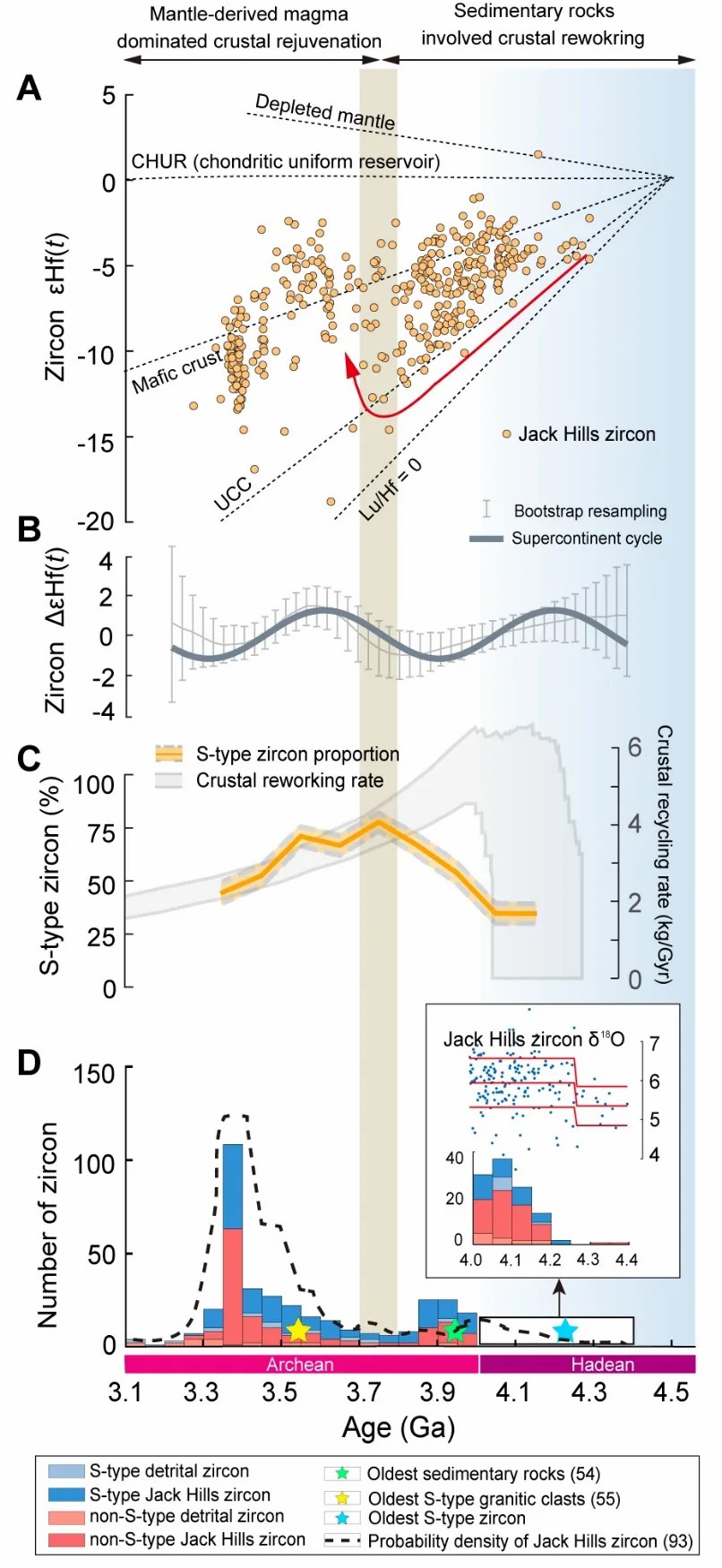 研究团队运用该模型对Jack Hills碎屑锆石进行预测分类,结果显示Hadean时期的S型锆石的比例达到了35%,这些锆石的年龄可追溯至地球形成后的几亿年内。这一发现表明,早在地球历史的早期阶段,地壳的风化、沉积岩的形成、沉积物的埋藏和再循环过程可能就已经开始。Jack Hills锆石中S型锆石的比例在4.1Ga-3.8 Ga之间从30%增长到80%,与εHf显示下降趋势存在一致性(图3)。而在3.8Ga-3.4 Ga之间,S型锆石的比例则从80%降低到40%,指示岩浆源区镁质成分的加入(图3)。这种成分的转变,表明从大陆地壳重熔到镁质岩浆作用的过渡,对应着地球早期的造山运动过程