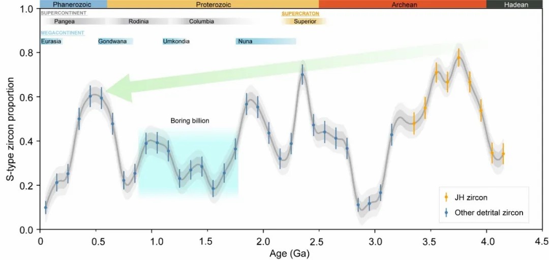 进一步对全球范围内的碎屑锆石进行了分类结果发现,从40亿年前至今,S型锆石的比例呈现出周期性的高峰,这些峰值与超大陆(supercontinents)或巨大陆(megacontinents)出现时间一致 (图 4)。这种周期性与超级大陆周期高度吻合,S型锆石的比例在超大陆聚合时期升高,而在超大陆裂解时期则下降。这表明,与现今相似的板块构造活动自地球早期可能已经开始活跃,驱动着大陆的运动和碰撞,从而形成S型锆石的周期性峰值和低谷。而这些S型锆石比例的周期展现了一个长期的下降趋势。Hadean时期较高的地幔势温可能会导致俯冲过程中更为频繁的板片断裂,进而导致更多与俯冲沉积物进入岩浆源区,从而产生更高比例的S型锆石。
