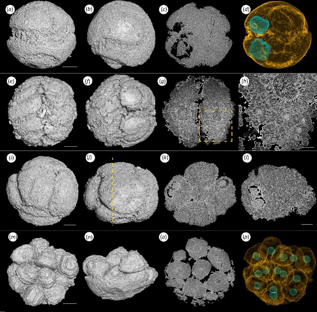 那么旋胞类究竟是如何发育的呢?它在动物总界中究竟是处于什么位置呢?为了回答这一难题,研究团队观察了数百枚旋胞类的标本,并采用同步辐射显微断层成像和显微CT扫描了其中176枚标本。基于三维数据,研究人员分析了旋胞类化石的埋藏学和生物学特征,发现旋胞类的标本主要是在早期分裂阶段,极少有超过64细胞期,且细胞表面的螺旋结构有利于细胞之间相互分离。研究人员通过对比旋胞类和其他瓮安胚胎状化石的异同,初步重构了其发育过程,认为它比脊笼球类的发育过程简单,更类似现存的动物单细胞近亲鱼孢子虫。因此旋胞类更可能代表了有多细胞发育阶段的单细胞生物,是后生动物的近亲,位于动物总界树的根部位置。