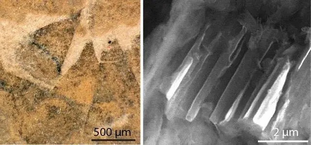 ↑ 图三:寒武纪多刺世山虫的锥形骨板和细微管状构造