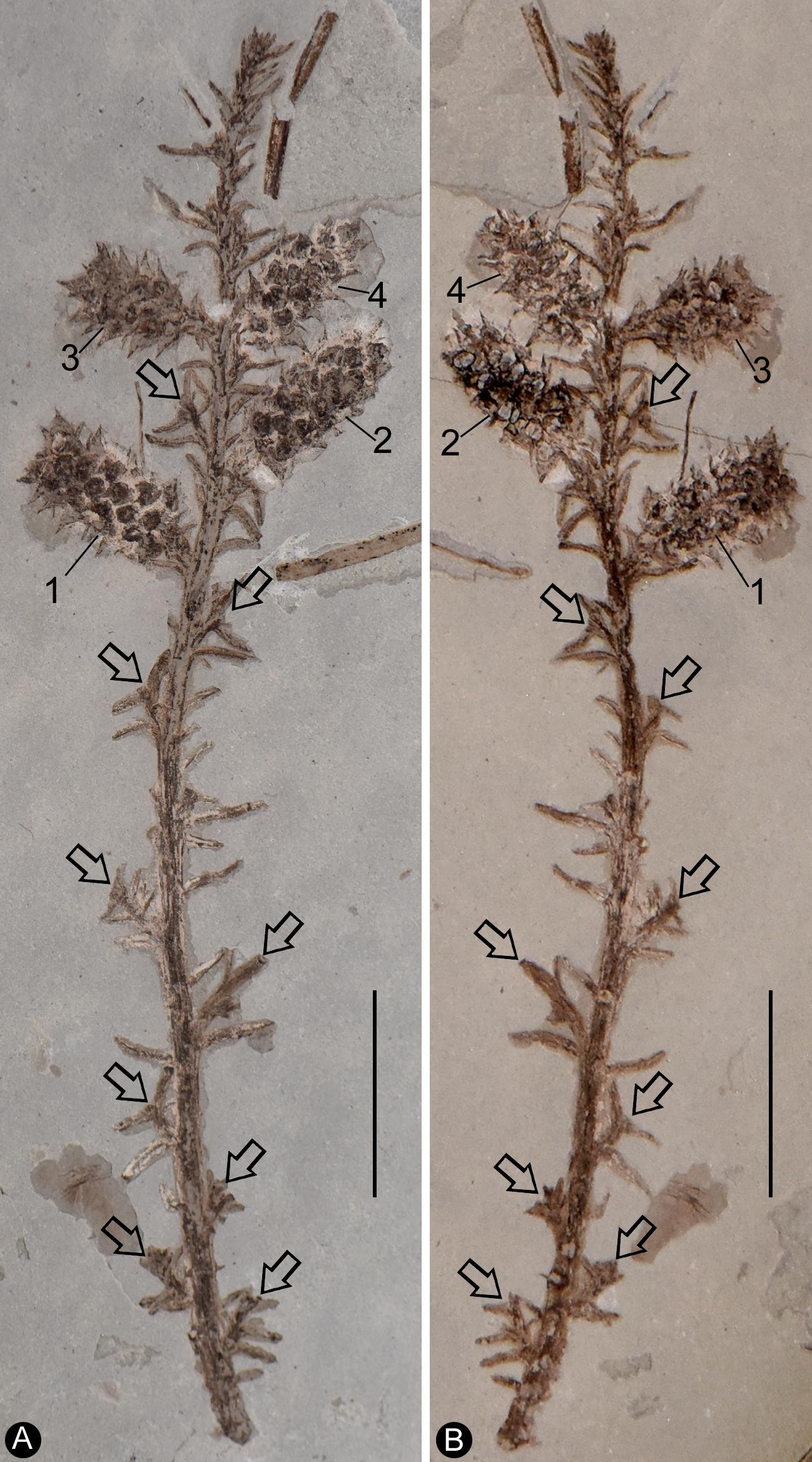 ↑ 正反面保存的模式标本,可见其和松柏类一样的叶和“球果”