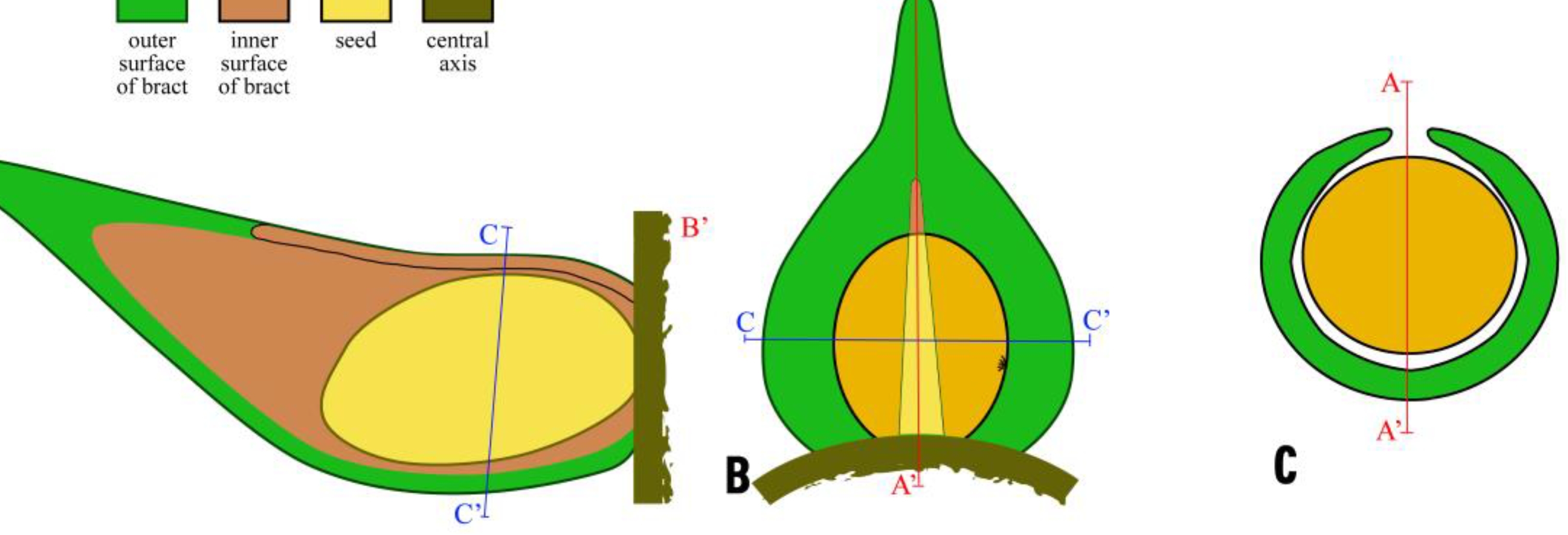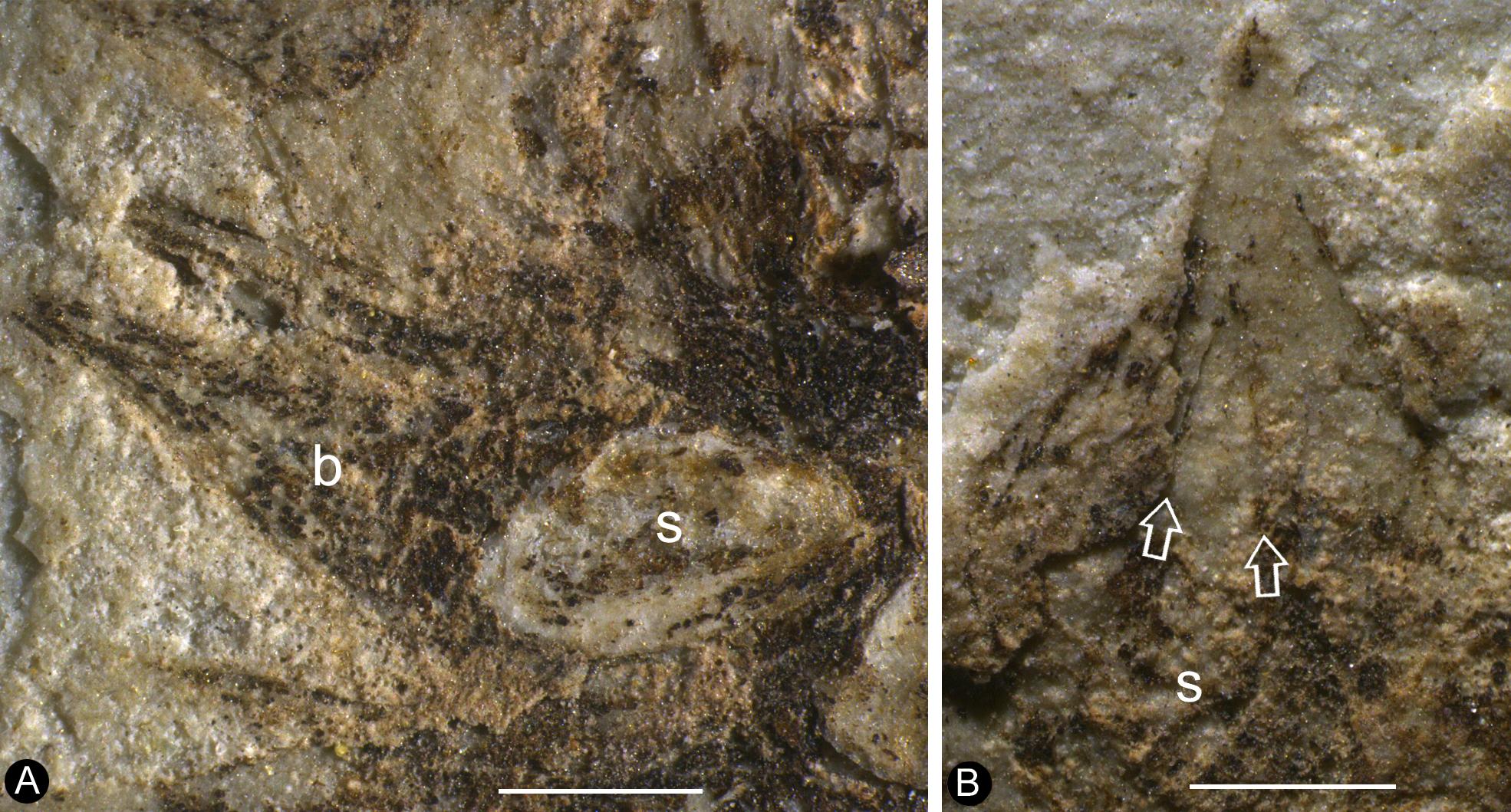 ↑ 侧生器官中的种子(s)及近轴面上未完全封闭的苞片的边缘(箭头)