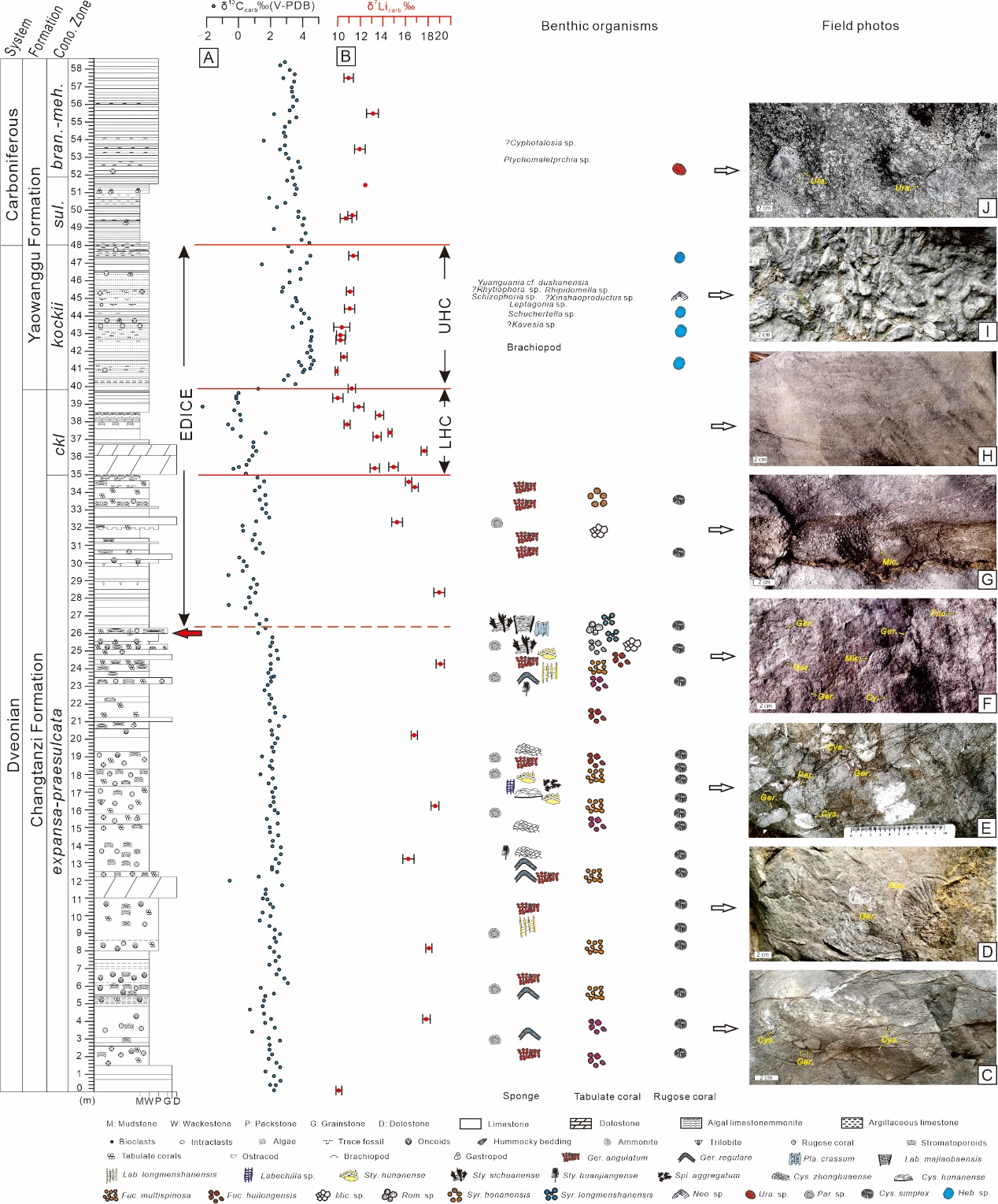 ↑ 四川龙门山长滩子剖面泥盆纪-石炭纪之交的地层和动物群变化