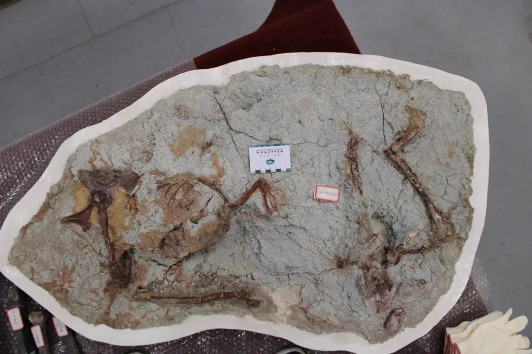 2021年夏天,内蒙古自然博物馆联合中国科学院古脊椎动物与古人类研究所对位于内蒙古自治区阿拉善左旗的毛尔图—大水沟化石点进行了科学考察。在考察过程中发现一处保存有两具较完整的紧邻恐龙骨架(图1),研究人员初步判断具有较大科研价值并进行了打包发掘。室内修复工作完成后进一步观察确认这件化石来自一亿多年前的白垩纪早期,属于一种小型兽脚类恐龙,为内蒙古丰富的化石资源再添一抹亮色。