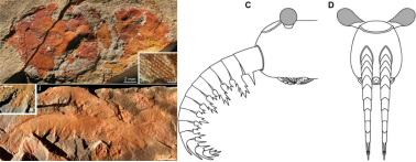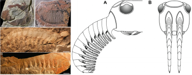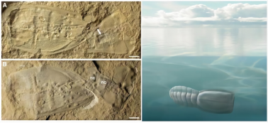 ↑ 图1 奥尔德里奇岛泳虫的化石(左图)与复原图(右图)。左图来源:[1],右图来源:wiki