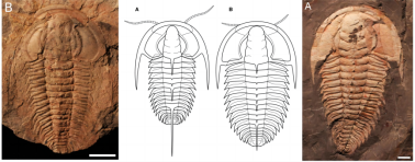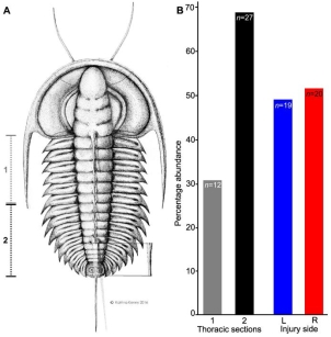 先对受害者进行一下调查吧。这一系列的捕食事件均发生在莱德利基虫属的三叶虫中,在鸸鹋湾村生活的莱德利基虫有两个物种,一种是打鼓莱德利基虫(Redlichia takooensis),另一种是君王莱德利基虫(Redlichia rex),这两个物种虽然都属于莱德利基虫属,但是前者的数量要远高于后者,大小要也要比后者小很多,打鼓莱德利基虫的体长不超过10厘米,大部分只有几厘米长,而君王莱德利基虫可以长达25厘米,超过10厘米的个体也很多。