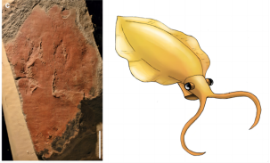 ↑ 图4 扁平古蠕虫化石(左图)与其近亲泳虾鱿(Nectocaris)复原图(右图)。左图来源:[4];右图来源:wiki.