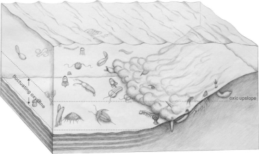 ↑ 图12 清江生物群的埋藏方式,海底泥石流和缺氧水体与布尔吉斯页岩型埋藏方式有关,鸸鹋湾页岩也是如此。图片来源:[10]