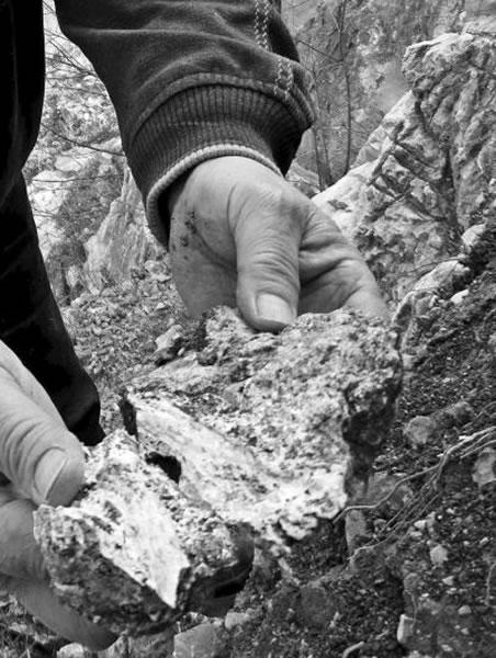 “瞧,这是一个牙齿。”山坡上,杨建军用木棍拨开厚厚的落叶,凸凹不平的风化石头上,一枚三四厘米长的牙齿化石清晰可见。“这,应该是一大型食肉脊椎动物的牙齿化石。”