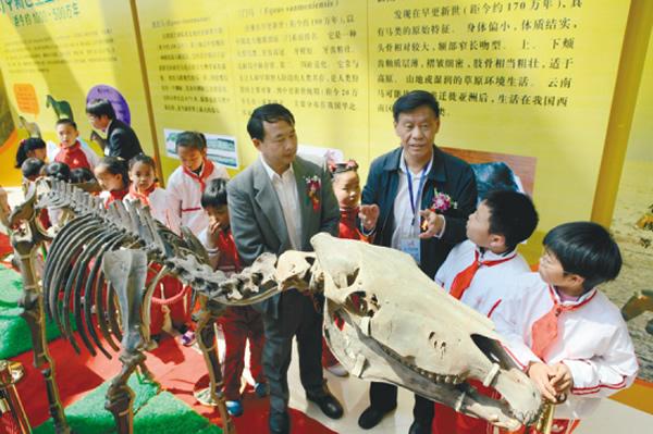记者在现场看到,除了珍贵的马化石以外,“马为什么会打响鼻?马为什么站着睡觉的?为什么马容易受到惊吓?”等有趣的知识引起了观众,特别是小学生观众的极大兴趣,许多小学生站在展板前认真地观看这些内容。