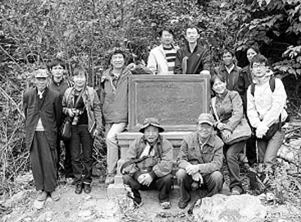 考古队队员在发现巨猿化石的信冲洞化石点留影
